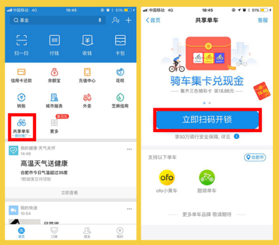 只要满足芝麻信用分要求(最低600分),就可以通过支付宝免押金/减免押金,骑共享单车哦。在支付宝首页点击【共享单车】,就可以了。