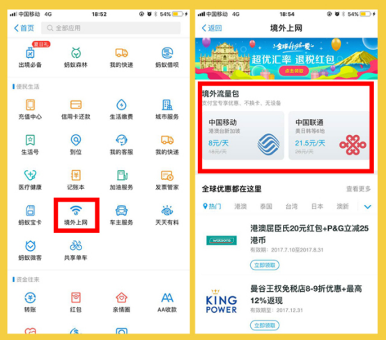 暑期应该很多宝宝会选择外出旅游,如果是出境游的话就得购买境外流量包。宝宝们可以直接在首页点击【更多】,选择便民生活中的【境外上网】就可以购买境外流量包了,还可以领取境外购物的优惠券哦。