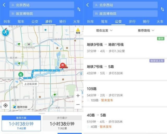 当我一点击“去这里”,高德地图就立即帮我规划出到故宫博物院的出行路线,步行、公交随你心意来选择,速度就是这么快,就是这么方便!