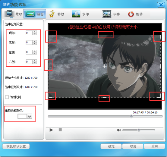 3、接着在“裁剪”窗口中通过拖动右边视频中的白色边框,或者直接在左侧的“顶部、底部、左侧、右侧”中输入数字,来达到调整截取位置的效果;