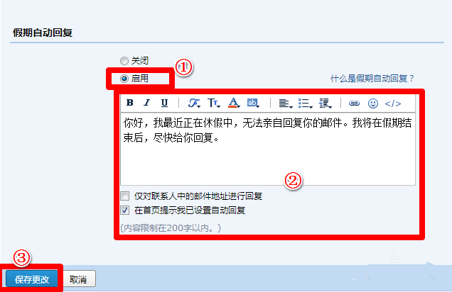 4、在常规设置下找到【假期自动回复】的栏目,选择【启用】并编辑自动回复内容,点击【保存修改】即可把以上所有更改内容进行保存。