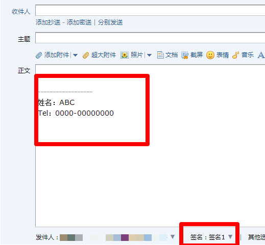5、进入写邮件的编辑界面,邮件正文内容下方会显示自己的个性签名。在写邮件的时候还可以在下方的【签名】选项处选择是否使用签名。