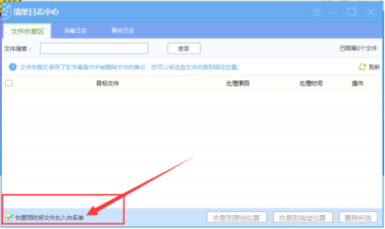 3、另外在“文件恢复区”中勾选上“恢复同时将文件加入白名单”,这样我们在恢复被误删的文件时就不用手动再去添加该文件到白名单了。