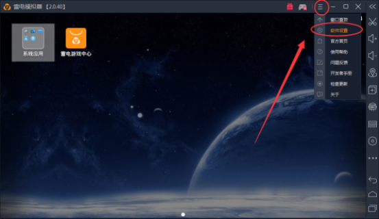 2、或者也可以在雷电安卓模拟器界面右上角的“菜单”中打开“软件设置”;