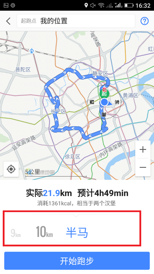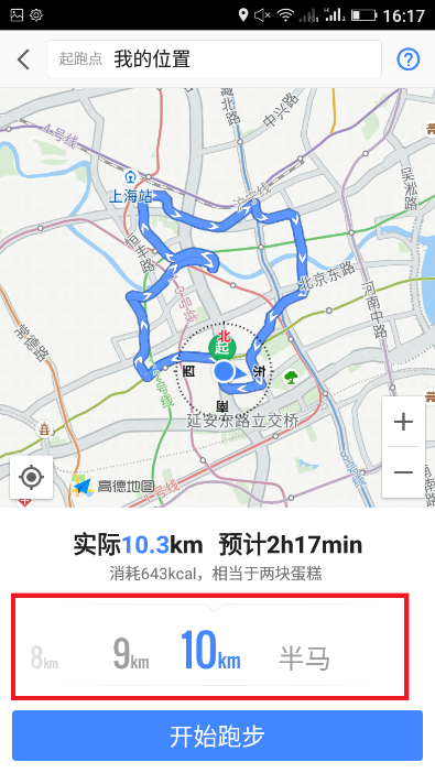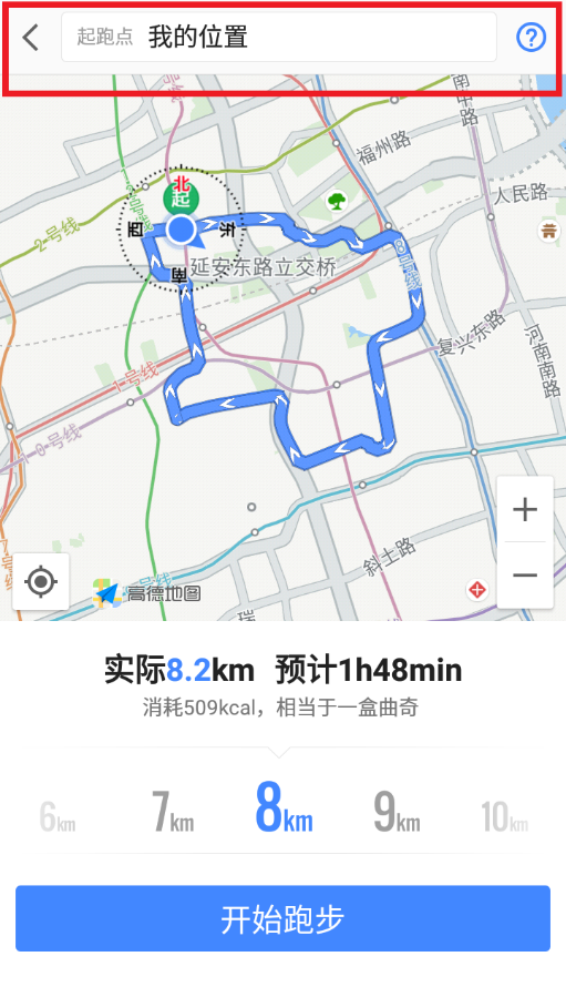 5、你不仅可以从当前位置出发,还可以在屏幕上方的“起跑点”设置栏中设置任一地点为起点,提前熟悉跑步路线。点击“开始跑步”后,高德地图即开始自动为你记录跑步的时间、里程和配速。
