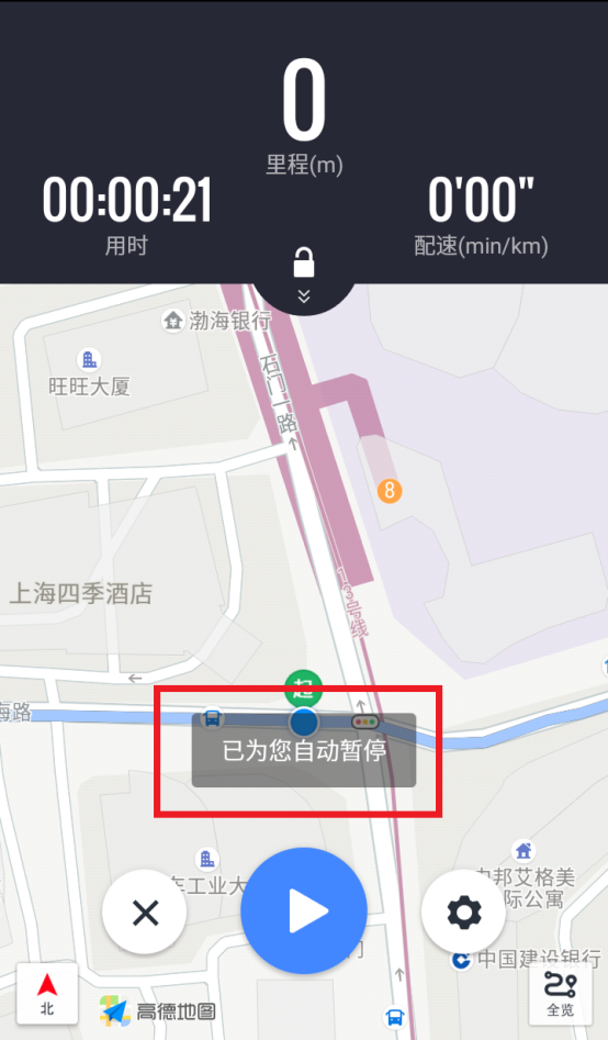 在跑步的过程中,你还可以点击屏幕右下角的“全览”按钮,查看自己已经跑到了整段路程的哪一个位置。你还可设置任一起跑点,超过20秒原地不动则自动暂停。