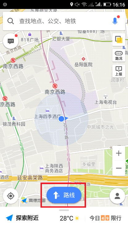 1、在手机上打开高德地图,在界面上点击“路线”按钮,