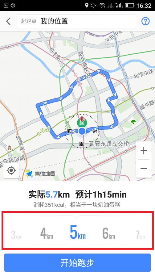 3、在屏幕下方设置好你要跑的公里数,高德地图就会为你自动规划出附近的一圈路线。