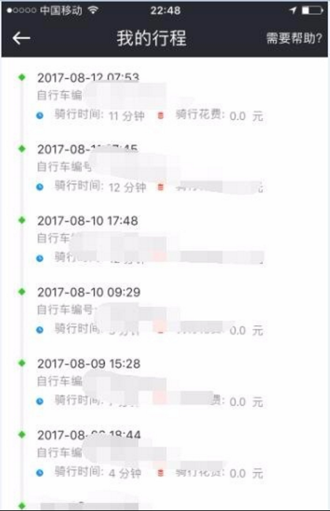 3、点击“我的行程”,就可以查看摩拜单车骑行记录了,包括日期、自行车编号、骑行时间、骑行花费等信息;