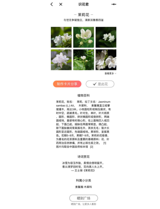 不仅如此,主页下方中间,还有一个识花「广场」的入口,让你足不出户就能饱览万花,看看其他人眼中的花花草草。