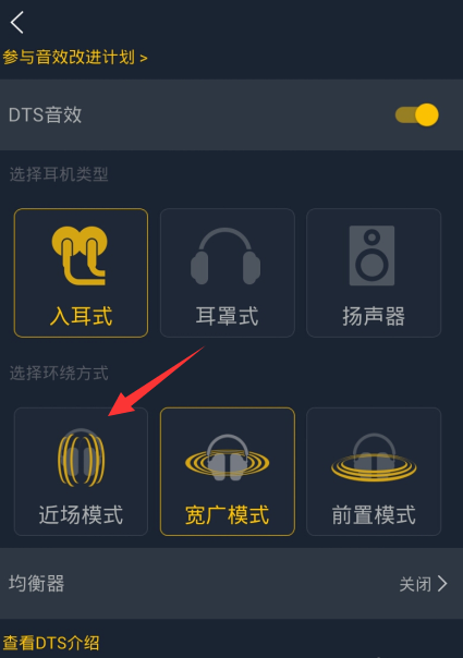 4、插入耳机之后qq音乐会自动检索适合我们的dts音效,如果你想更换耳机类型跟环绕方式的话,我们只需要单击自己想要更换的那一项即可。比如想更换为“近场模式”,那么就单击该模式。