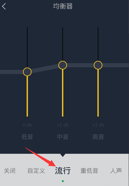 7、往左滑动之后会出现很多均衡类型供我们选择,我们单击想要设置的均衡模式,比如想设置为“流行”,那么就滑动到“流行”选项即可。