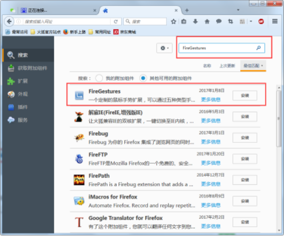 2、接着在“扩展”的搜索框中搜索“FireGestures”,搜索完毕后下载安装该插件(安装完毕后记得重启浏览器),如下图所示: