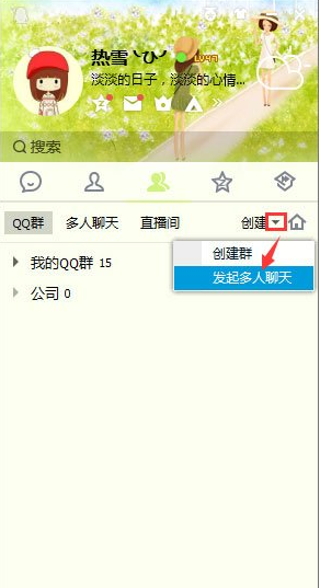 2、点击创建,在出来的选择中选择“发起多人聊天”。