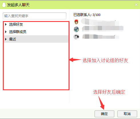 3、然后在发起多人聊天界面,选择你想要进行多人视频的好友,然后点击“确定”。