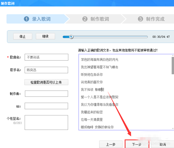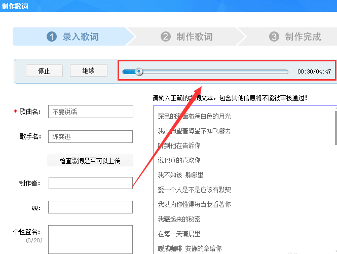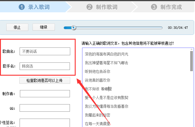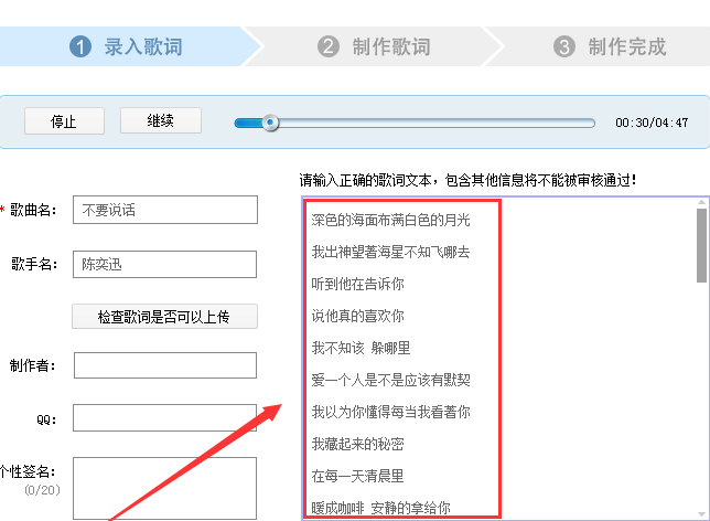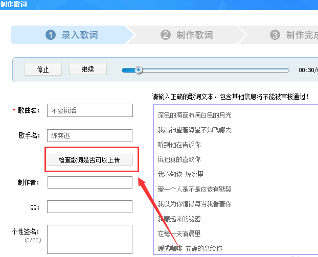 7、然后在导入歌词的页面所有信息都输入完后,点击检查歌词是否可以上传。