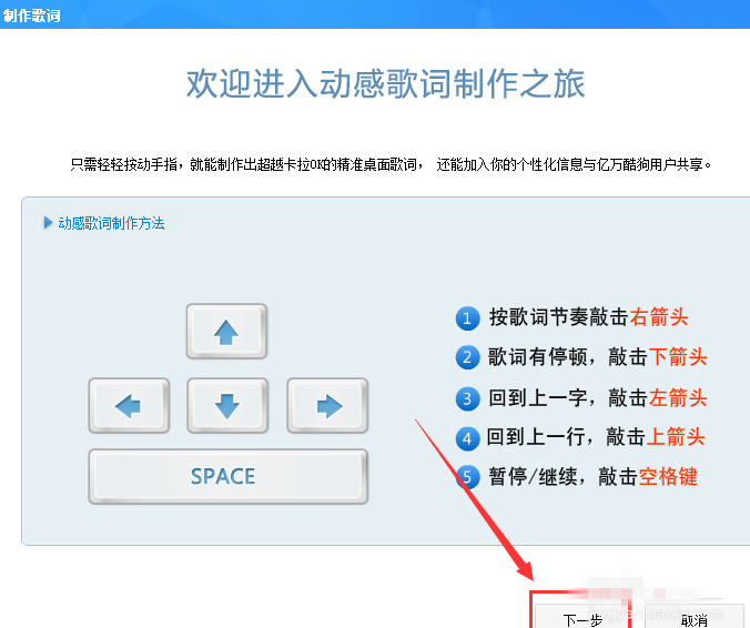 4、然后会弹出一个窗口示范歌词制作方法,可以选择看完再点击【下一步】。