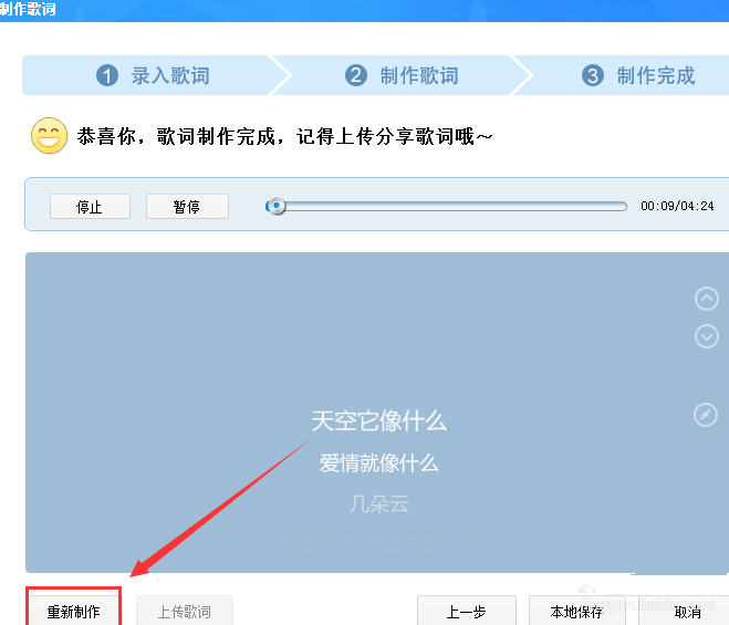 10、点击下一步,开始查看制作的歌词效果,如果感觉不满意可以选择点击【重新制作】重新开始制作歌曲的歌词。