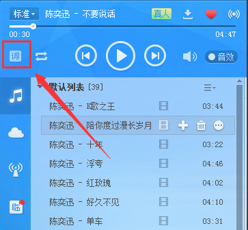 2、随后点击进度条下面的一个“词”字样的图标,这个图标便是歌词显示桌面。