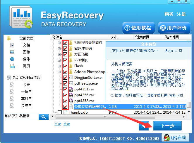 4、勾选要恢复的U盘文件。找到想要恢复的U盘文件后,可以点击预览进行确认,接着在要恢复的所有文件前的方框中点击勾选,然后点击“下一步”按钮。