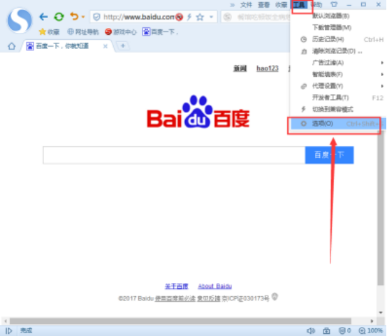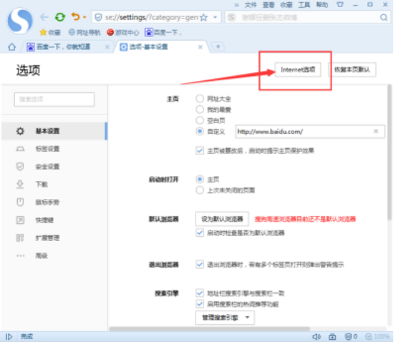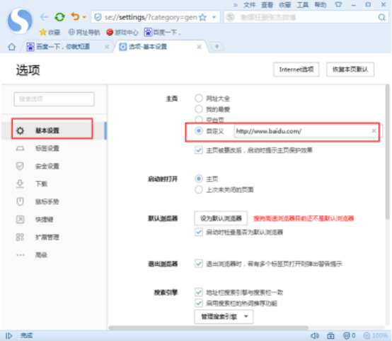 2、在搜狗浏览器右上角的“工具”中打开“选项”,然后在“基本设置”中的“主页”里选择“自定义”,并将后边的主页修改成我们想要的网址即可;