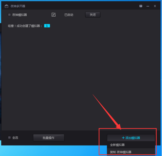 5、打开它后在弹出的“夜神多开器”窗口右下角点击“添加模拟器”,点击后它会让我们选择是打开一个全新的模拟器,还是复制上一个模拟器,根据自己需求选择即可;