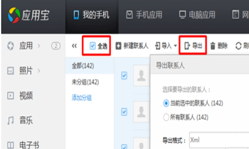 2、接下来,选择你要转移的联系人或者【全选】,然后点击【导出】。默认格式Xml是一个可行的方案,使用通过。