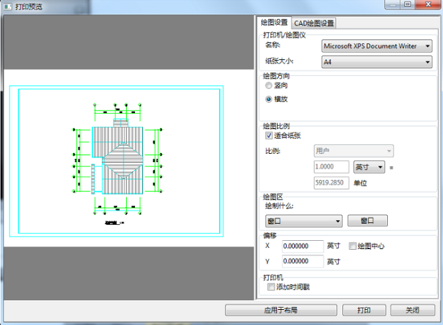 第五步、选择打印区域后,会自动弹出打印预览,打印预览中就会显示所选择的图纸内容。最后根据要求对设置其他打印效果进行打印即可。