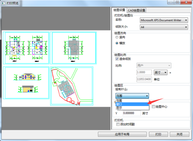 第三步、在打开的“打印预览”窗口的“绘图设置”菜单中,我们可以即可对打印的CAD图进行设置,这里想要打印CAD图中的一部分,可以在绘图区的范围中选择“窗口”。