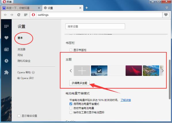 2、接着在设置界面的“基本”设置中找到“主题”,在这里就可以看到Opera浏览器自带的一些主题皮肤了;