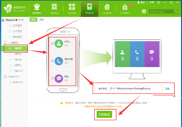 勾选上想要备份的功能(目前蜂助手支持备份“联系人”、“通话记录”、“短信”),勾选完毕后在设置一下备份文件的保存位置,最后点击“开始备份”就可以了。