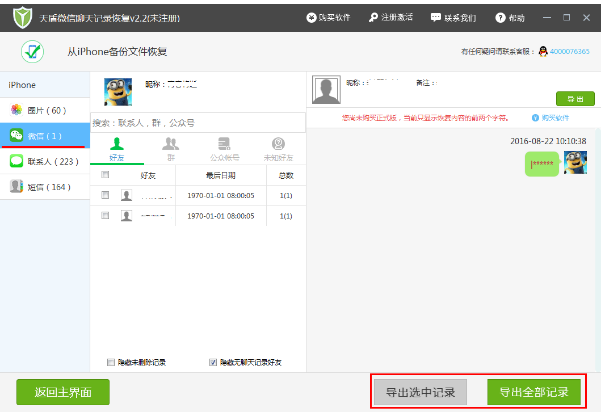 5、在左侧选项中点击“微信”,即可在右侧查看微信记录。当只需要恢复个别微信好友记录时,勾选出好友前的方框后,点击“导出选中记录”;若是想要恢复所有的聊天记录,则点击“导出全部记录”。