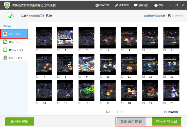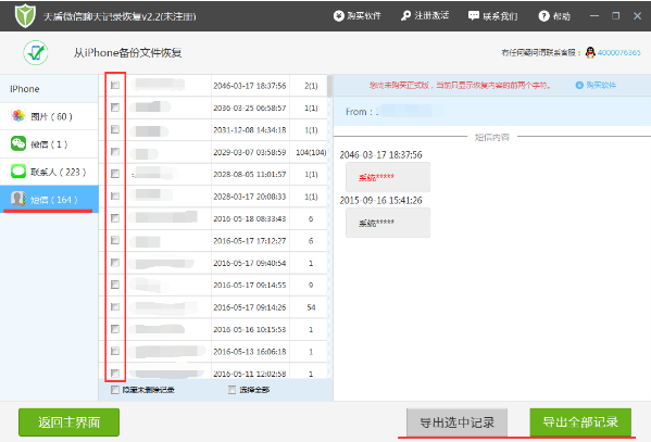 7、点击“短信”,可以点击“导出全部记录”将全部短信恢复,也可以勾选部分短信后,点击“导出选中记录”。