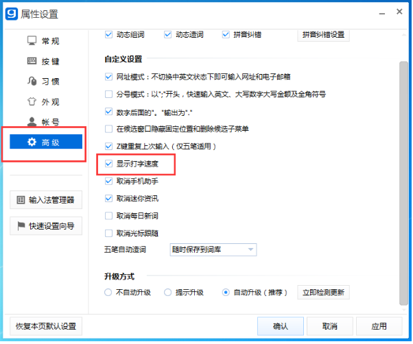 2、在“设置属性”窗口中打开“高级”,在“高级”界面找到“显示打字速度”并勾选上它;
