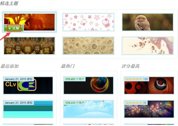 3、当然我们也可以搜索自己喜欢的主题,点击“获取更多主题”然后寻找自己想要的主题皮肤,找到后点击“添加”按钮浏览器就开始应用你添加的主题了。