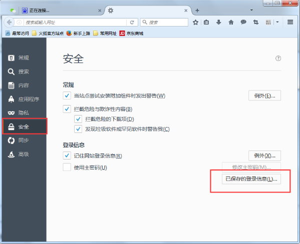 2、接着在选项界面的左侧打开“安全”分类,接着在右边找到“已保存的登录信息”按钮并打开;