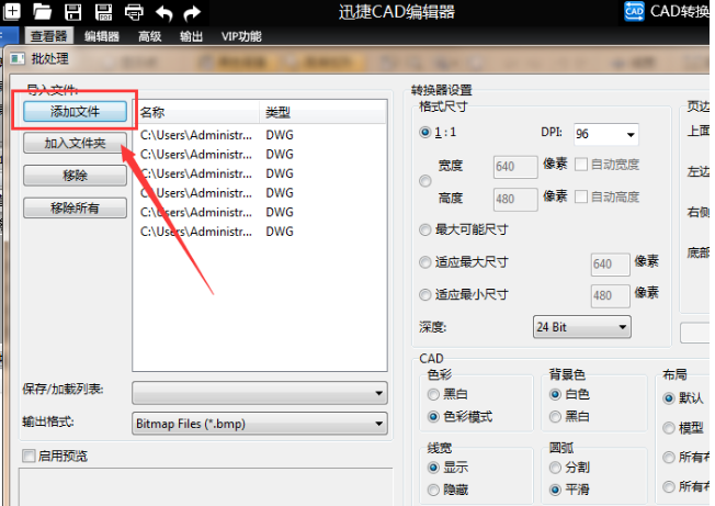 2、进入批处理界面,点击“添加文件”按钮,将需要进行转换的批量CAD文件添加到软件界面里。
