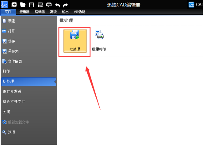 1、运行迅捷CAD编辑器,点击“文件”按钮,然后点击里面的“批处理”选项。