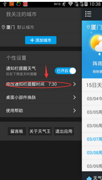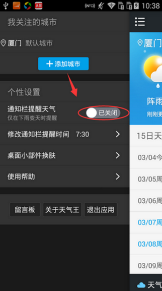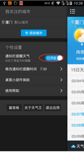 2、接着左侧会弹出功能列表,选中【通知栏提醒天气】将其开启(ps:这个提醒仅在下雨天时提醒哦)