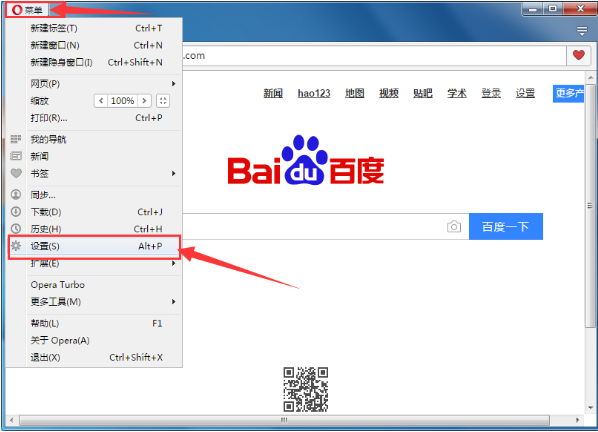 1、首先我们打开Opera浏览器,然后在其左上角的“菜单”中打开“设置”;