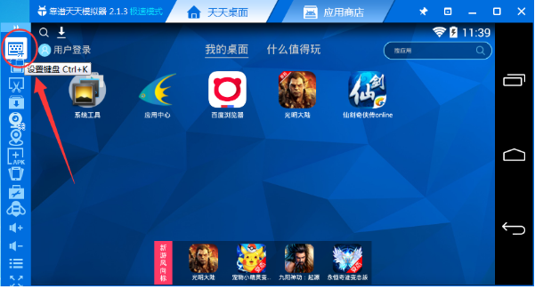 1、首先我们打开天天模拟器,接着在主界面左边的工具栏中打开“设置键盘”;