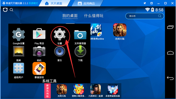 1、我们打开天天安卓模拟器,在主界面的“系统工具”中打开“设置”功能;