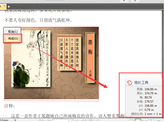 4、样式格式编辑完成之后,即可对PDF文件里的图形进行测量,测量完成后,点击鼠标右键,然后点击“完成”选项,软件右下角就会显示出测量的数据。