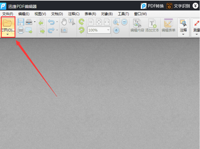 1、首先打开迅捷PDF编辑器,点击软件界面的“打开”选项,将需要测量的PDF文件打开。