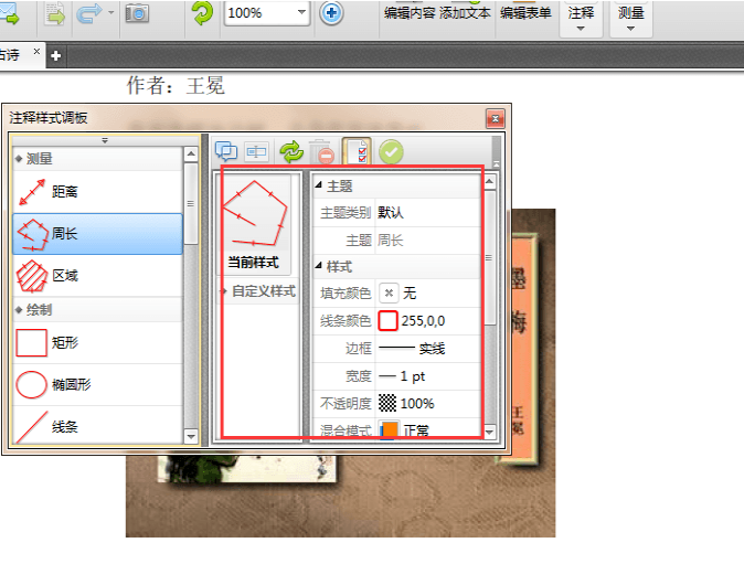 2、PDF文件打开后,点击“测量”按钮,接着选择里面其中的一个测量工具,然后点击“注释样式调板”按钮。