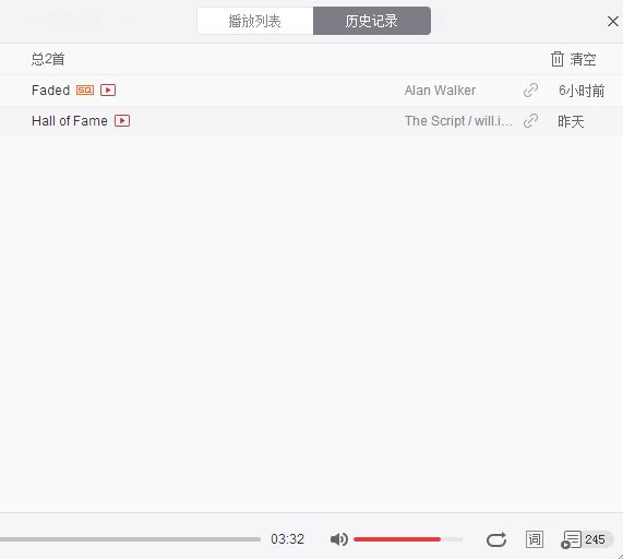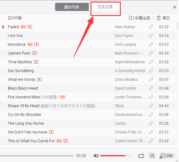 2、在播放列表中我们就能看到“历史记录”的选项了,点击进去就可以看到之前播放过的所有歌曲了。