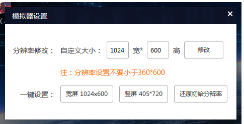 3、接着在弹出的“设置”窗口中就可以看到新浪手游助手设置分辨率的功能了,设置完毕后重新启动新浪手游助手即可生效。