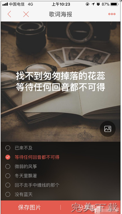 3、接着选择自己演唱的某个作品,最后勾选相关的歌词、设置好图片后点击“保存图片”或是“分享图片”就完成啦~