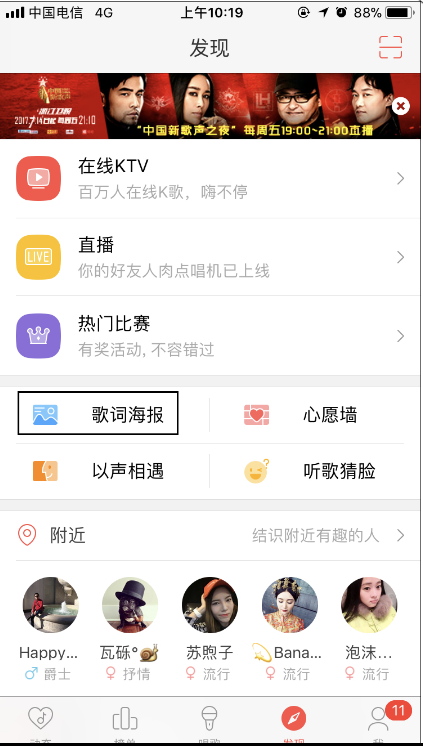 2、登录之后点击界面下方的【发现】,再点击【歌词海报】;
