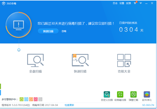 作为一款杀毒软件,360杀毒的界面设计很好得将“干净”“清新”的感觉表现出来。我们从界面上可以清楚地看到,这款软件主要的两个扫描(全盘扫描、快速扫描)功能。